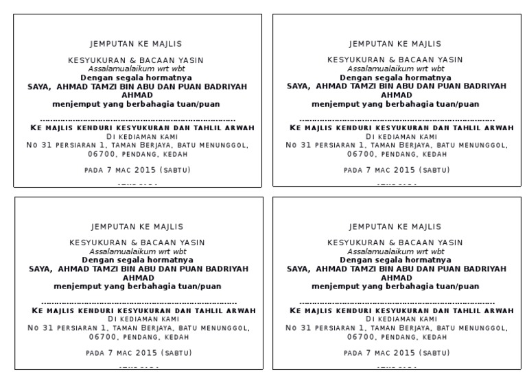 Bacaan Yasin Contoh Kad Jemputan Majlis Tahlil Arwah