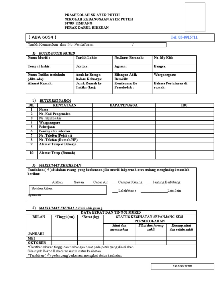 Borang Rekod Peribadi Dan Maklumat Kesihatan Murid