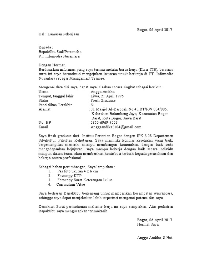 Surat Lamaran Kerja Untuk Fresh Graduate Bagi Contoh Surat