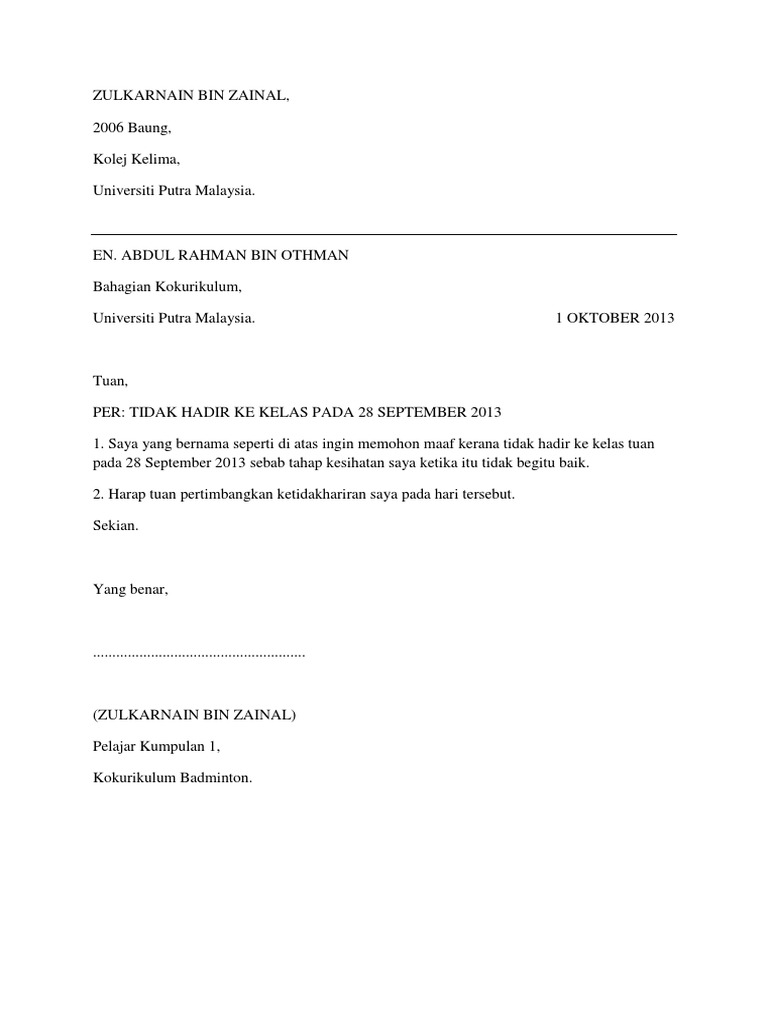 Contoh Surat Rasmi Tidak Hadir Ke Kuliah Universiti