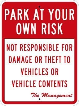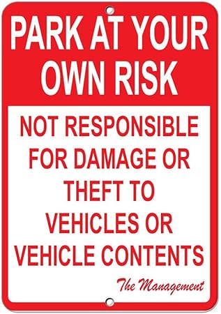 Outdoor Warning Safety Sign Park At Your Own Risk Not Responsible For Damage Or Theft 8 12 Durable Uv Resistant And Waterproof Metallic Tin Signs Amazon Co Uk Garden Outdoors
