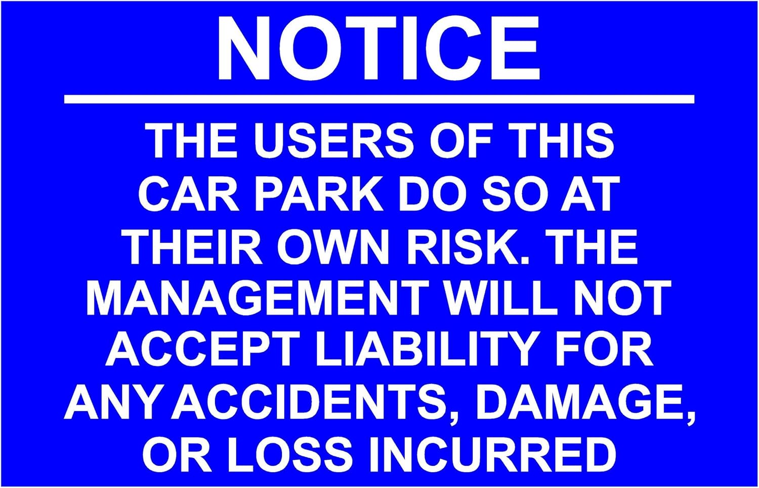 The Users Of This Car Park Do So At Their Own Risk The Management Will Not Accept Liability For Any Accidents Damage Or Loss Incurred Sign