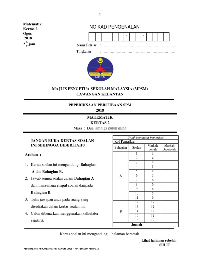 Peperiksaan Percubaan Spm 2018 Matematik Kertas 1 Majlis Pengetua Sekolah Malaysia Mpsm Cawangan Kelantan