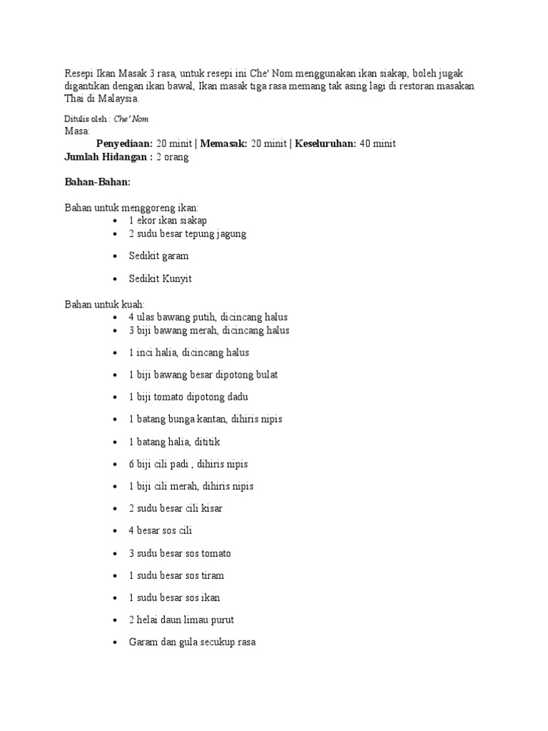 Resepi Ikan Siakap 3 Rasa Che Nom