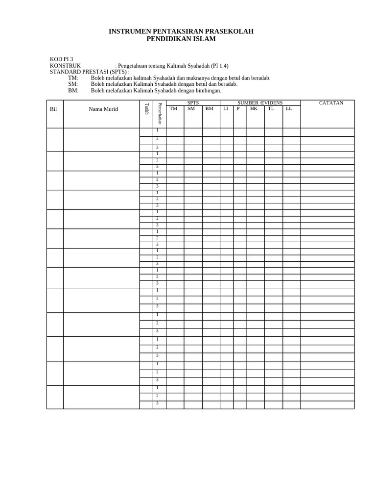 Contoh Borang Senarai Semak Prasekolah