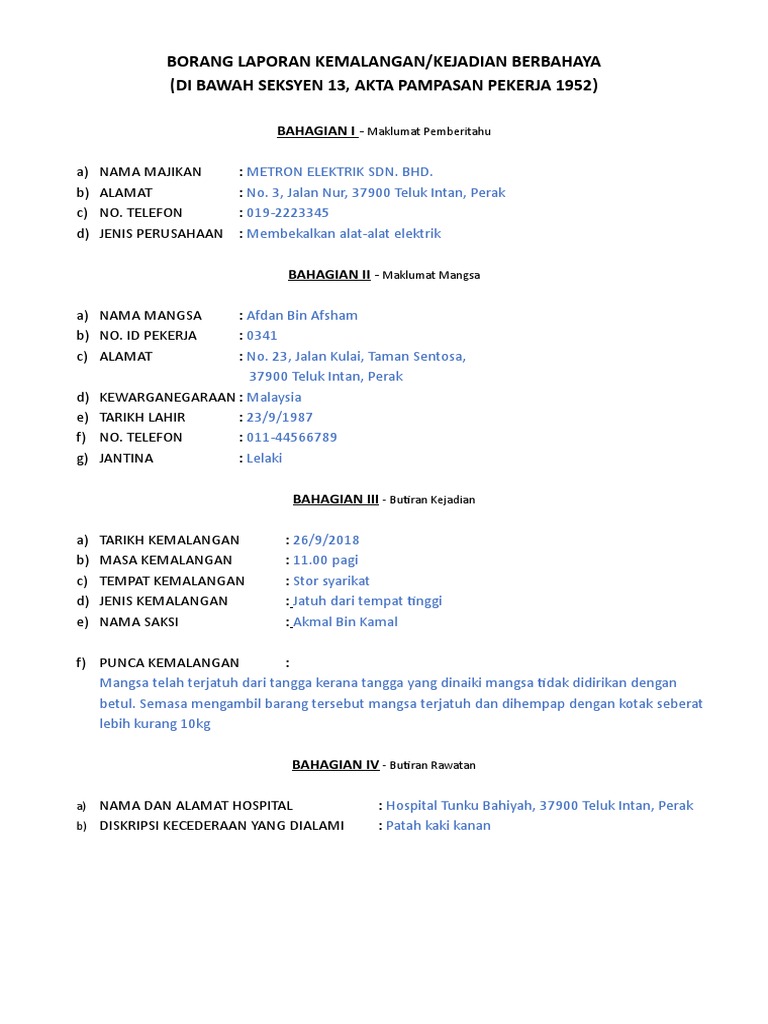 Syarikat Contoh Laporan Kemalangan Di Tempat Kerja